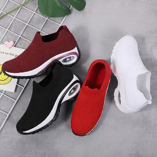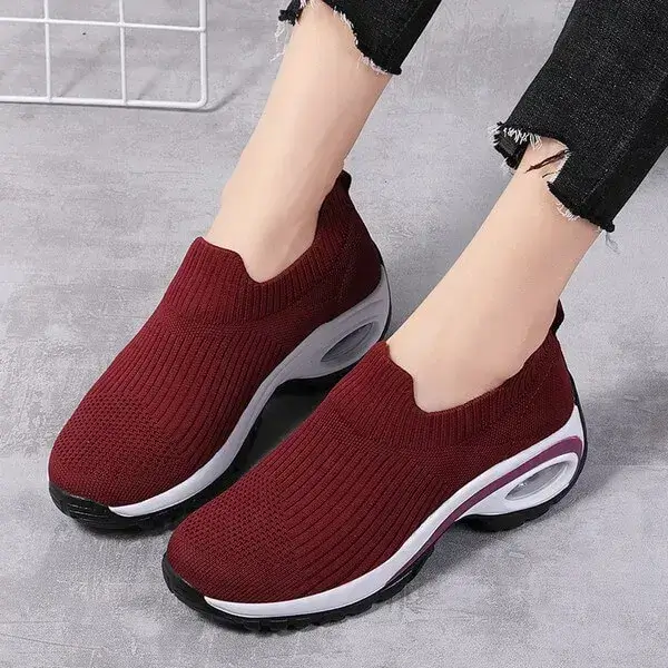 Step into style and comfort with our Mesh Air Cushion Platform Sneakers for Women. These fashion slip-on comfort shoes in Black, Date Red, and Red feature a breathable mesh upper and an air cushion platform sole. Perfect for casual outings or long walks, they blend chic design with all-day support.