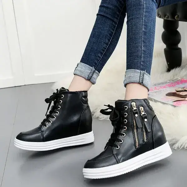 Step up your style with our Womens Side Zipper Sneakers. These temperature-regulating high-top casual shoes in Black and White feature a PU upper, breathable design, and a durable rubber sole with a wedge heel. Perfect for all seasons, they offer comfort and flair with convenient side zippers.